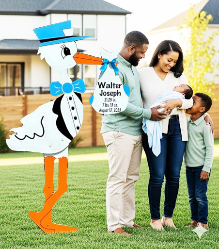 Every rental also includes a personalized keepsake with your baby’s name or welcome message, giving parents something to cherish long after the stork comes down. Whether you’re surprising new parents or making your own announcement, our stork yard signs provide a heartfelt, memorable way to celebrate the newest addition to the family.