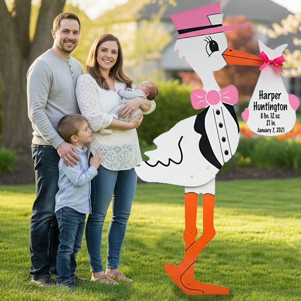 Our impressive 6-foot stork lawn signs, available in pink or blue, make any birth announcement truly stand out.